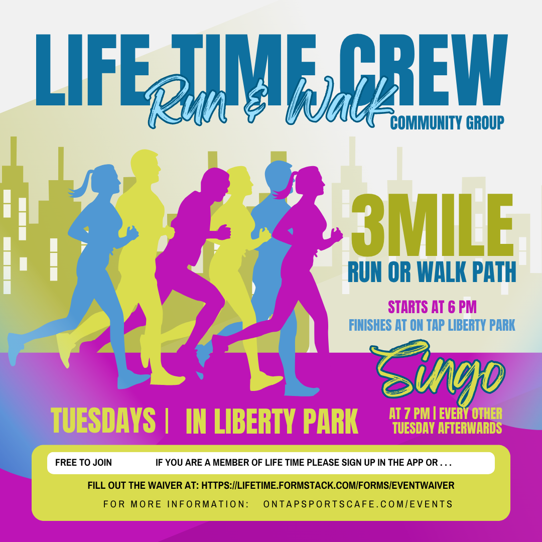 Life Time Crew: Run & Walk Community Group meets every Tuesday at 6pm from the On Tap Liberty Park parking lot. Come join them on a 3 mile (safe path) around the neighborhood. Hosted by Life Time & Brooke Smith Weaver. All levels, all ages welcome. Every other Tuesday join them back at On Tap in Liberty Park for Singo at 7pm!